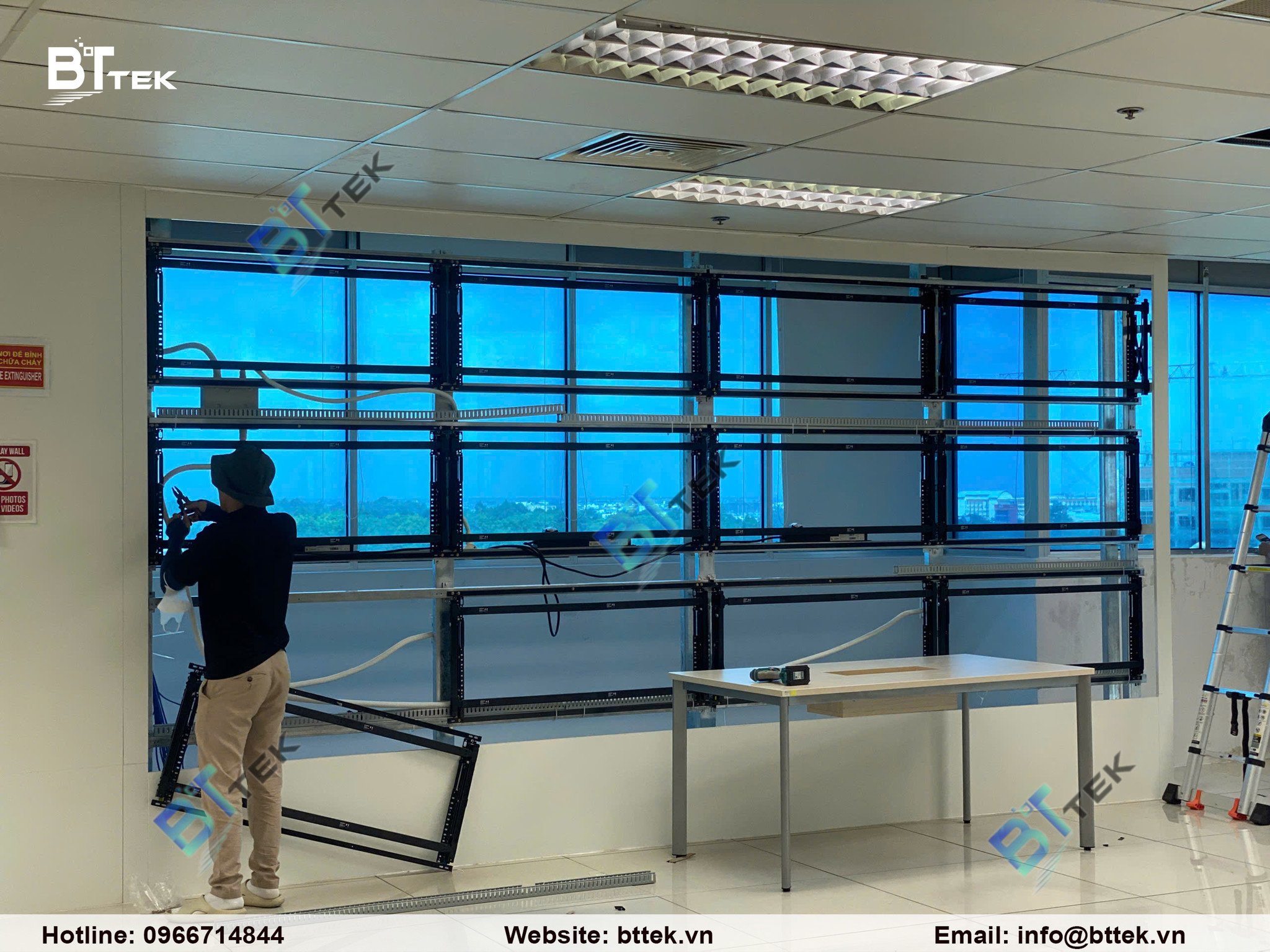 - Lắp đặt khung treo màn hình ghép, căn chỉnh khung chính xác theo thiết kế 4x3