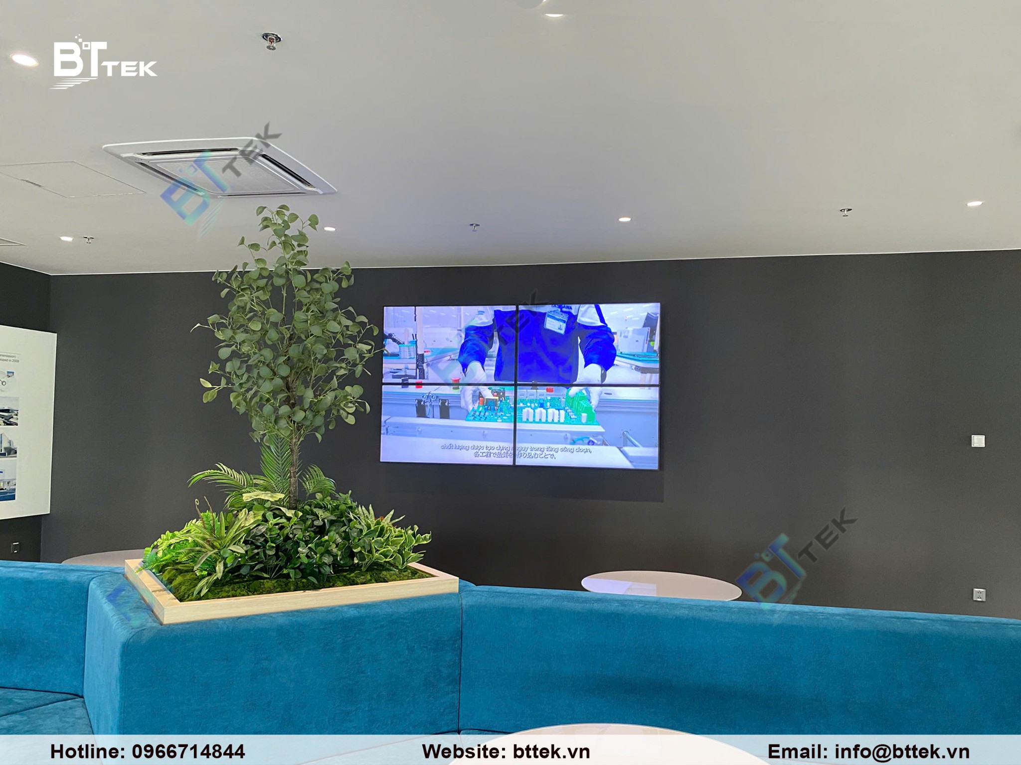 Hệ thống Video Wall 2x2 từ 4 màn hình 55 inch được triển khai tại sảnh chính, tạo điểm nhấn hình ảnh cho doanh nghiệp.