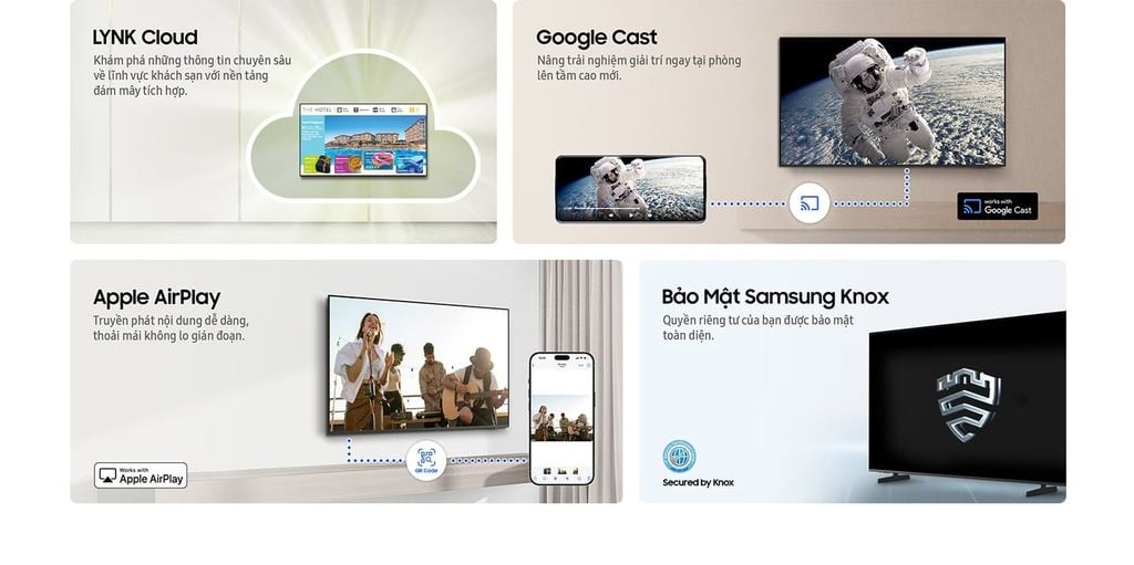Samsung Knox bảo mật TV khách sạn bằng cách chặn các ứng dụng độc hại hoặc truy cập vào trang web lừa đảo, cũng như bảo vệ thiết bị IoT được kết nối. Nhờ đó, dữ liệu nhạy cảm của khách như mã PIN và mật khẩu được bảo vệ qua nhiều lớp phần mềm và phần cứng.