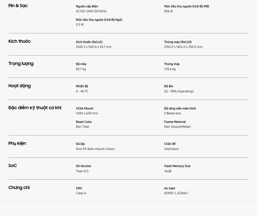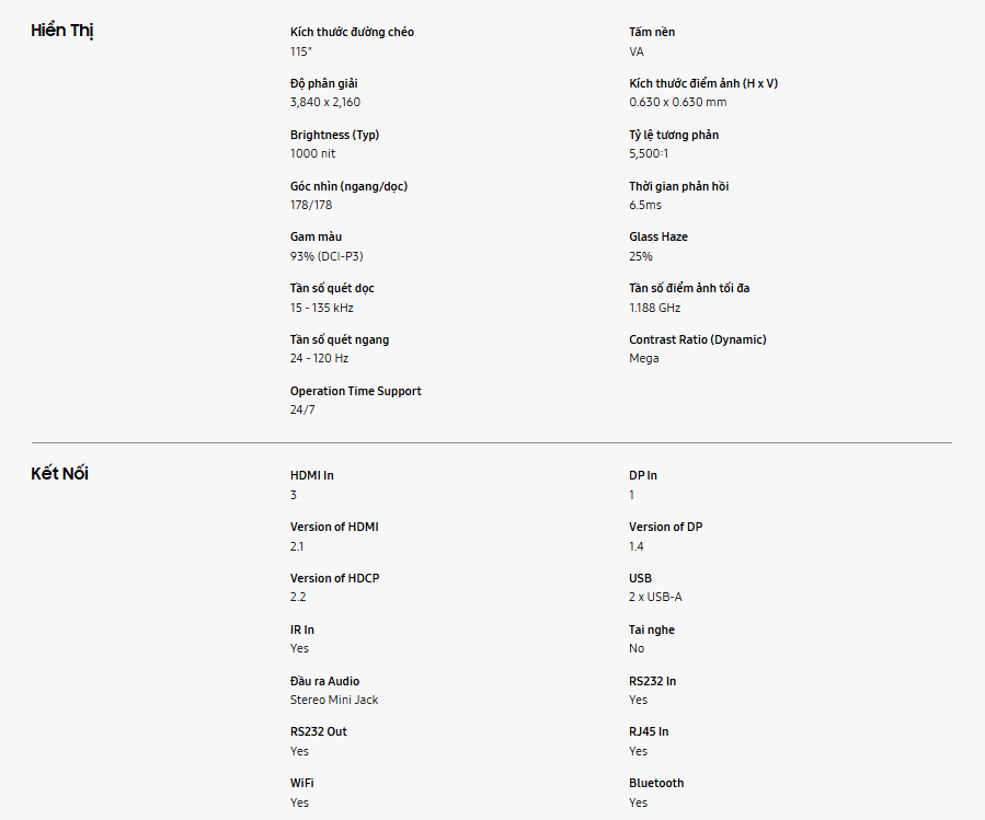 Tiêu chuẩn mới cho màn hình cỡ lớn. Bước vào kỷ nguyên mới của màn hình thương mại với mẫu màn hình độc lập 115 Inch từ Samsung. Được thiết kế để kể chuyện sống động hơn với hình ảnh, sản phẩm mang đến hiệu ứng thị giác ấn tượng cho nhiều không gian thương mại – từ cửa hàng bán lẻ cao cấp, phòng họp doanh nghiệp đến rạp chiếu phim, sân vận động trong nhà và hơn thế nữa. Từ kích thước vượt trội, thiết kế siêu mỏng đến khả năng lắp đặt linh hoạt và chất lượng hình ảnh cao cấp, màn hình này đáp ứng trọn vẹn mọi yêu cầu. Được tối ưu để vận hành 24/7, sản phẩm kết hợp thiết kế tinh xảo với độ bền chuẩn thương mại, mở ra tiềm năng sáng tạo và vận hành mới cho doanh nghiệp.