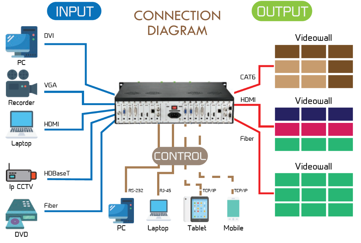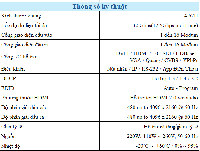 4 x 4 lên tới 16 x 16 khe đầu vào x đầu ra có cổng trộn