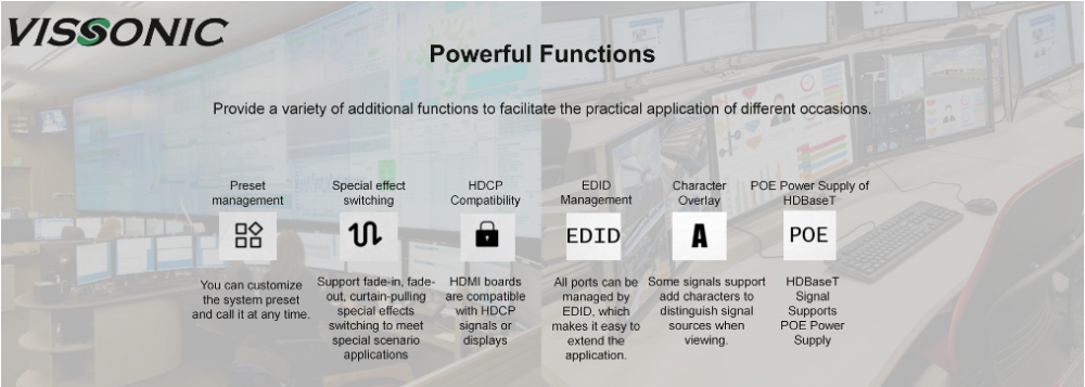 Bộ điều khiển màn hình ghép module dòng X9 có thể thực hiện xử lý đồ họa và chuyển đổi liền mạch một cách linh hoạt. Ma trận áp dụng thiết kế phần cứng hiệu suất cao, hỗ trợ hoàn hảo nhiều loại chuyển đổi và xử lý tín hiệu kỹ thuật số / analog độ phân giải cao và hỗ trợ RS-232 hai chiều, chức năng chuyển mạch được gán tín hiệu IR hai chiều. Nó cũng có thể chia tín hiệu hình ảnh hoàn chỉnh thành nhiều tín hiệu được gán cho nhiều đơn vị hiển thị khác nhau, tạo thành một màn hình hiển thị lớn để hiển thị hình ảnh động. Nó cung cấp giải pháp một cửa cho các ngành khác nhau để gán, chuyển đổi và xử lý nhiều loại tín hiệu video và điều khiển, có thể được sử dụng rộng rãi trong kỹ thuật phát thanh và truyền hình, phòng hội nghị đa phương tiện, kỹ thuật hiển thị màn hình lớn, giảng dạy truyền hình, giao thông thông minh trung tâm quản lý, trung tâm chỉ huy và kiểm soát và những nơi khác.
