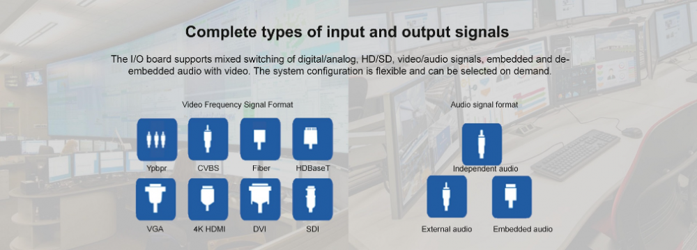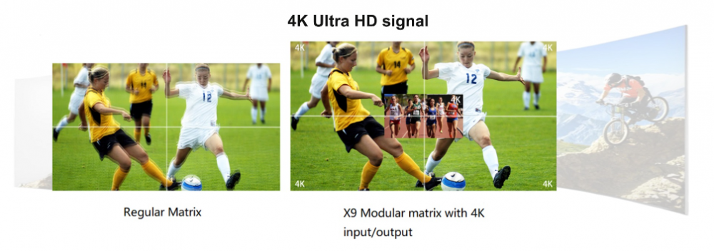 Bộ điều khiển màn hình ghép module dòng X9 chứa 0808,1616,3636,7272 và các mẫu khác, giao diện đầu vào/đầu ra tín hiệu của nó chứa HDMI, DVI, VGA, HDBaseT, SDI, cáp quang và các giao diện video khác. Công nghệ xử lý tín hiệu kỹ thuật số hàng đầu đảm bảo xử lý không bị biến dạng, gửi màn hình chất lượng hàng đầu đến thiết bị đầu cuối hiển thị. Với cấu hình tùy chỉnh của nhiều loại bảng đầu vào / đầu ra giống nhau hoặc khác nhau, có thể hình thành loại giao diện đơn hoặc loại ma trận đa giao diện, chẳng hạn như ma trận sợi quang, ma trận HDMI, ma trận DVI, ma trận CAT5, ma trận VGA, ma trận YUV, Ma trận video, v.v.