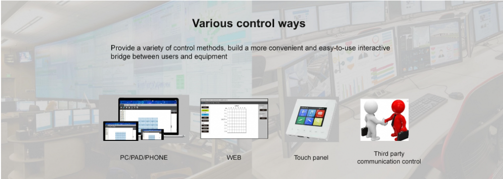Bộ điều khiển màn hình ghép module dòng X9 cung cấp nhiều chế độ điều khiển, với thao tác điều khiển từ xa, bàn phím mở rộng RS-485, đồng thời cung cấp hai giao diện truyền thông RS-232 tiêu chuẩn và cổng mạng, thuận tiện cho người dùng phối hợp với nhiều thiết bị điều khiển từ xa khác nhau.
