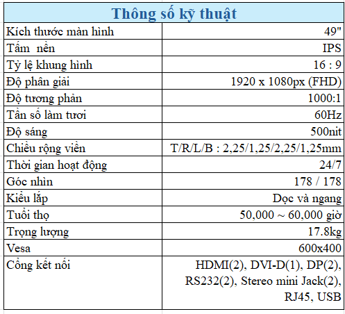 Màn hình ghép viền mỏng 3.5mm FHD 49" 500 nits