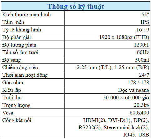 - Giao diện: HDMI/ DP/ DVI-D/ USB/ RS232C/ RJ45/ Âm thanh/ IR