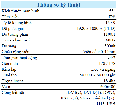 Màn hình ghép viền mỏng 0.88mm FHD 55" 500 nits